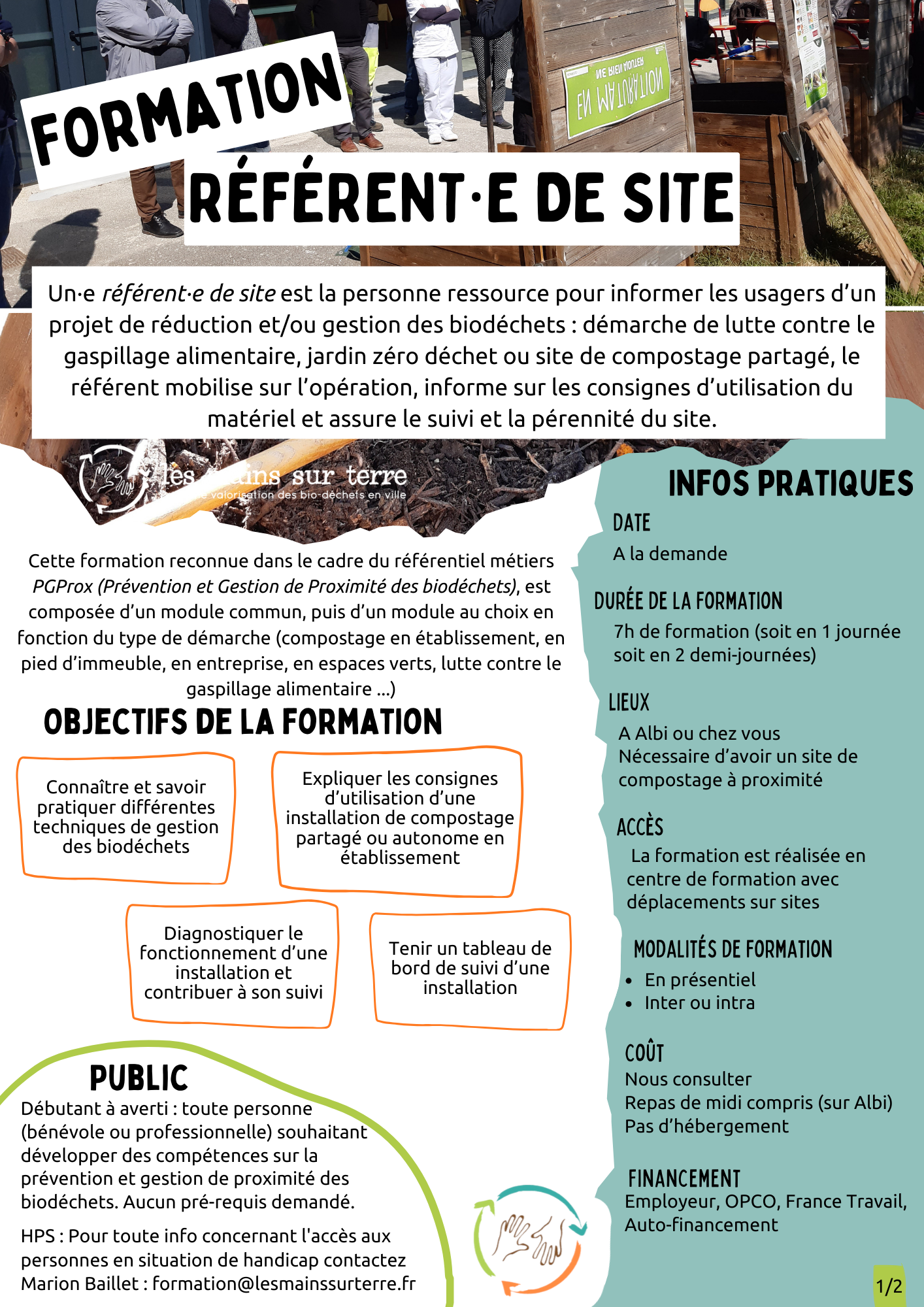 - Formation Référent·es de site (de compostage partagé / de compostage autonome en établissement / de toilettes sèches / de démarche lutte contre le gaspillage alimentaire / d’espace vert …) :